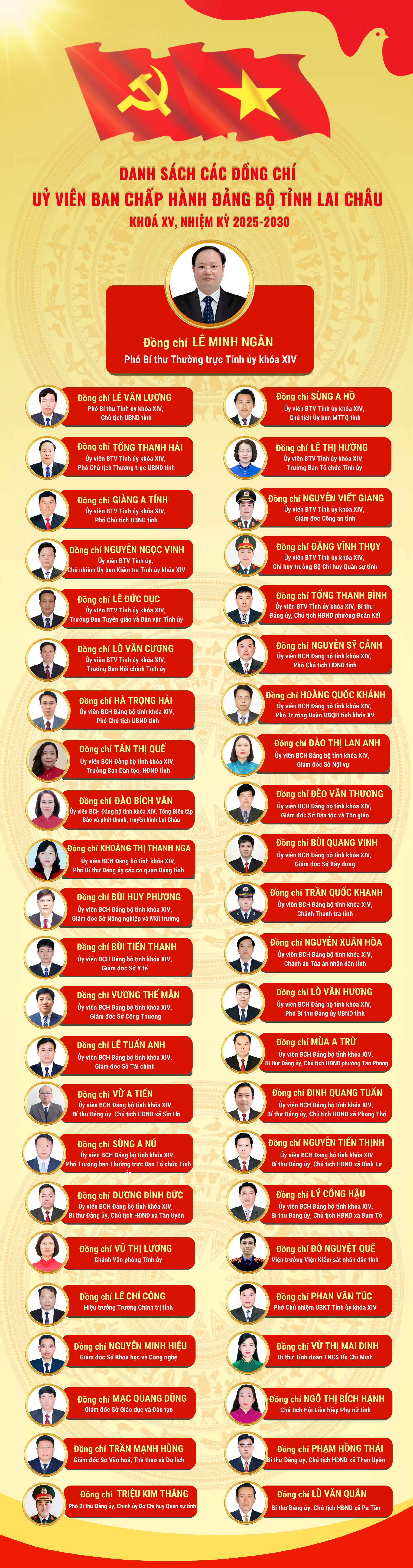 Chiều 18/9, tại Trung tâm Hội nghị - Văn hóa tỉnh Lai Châu, Đại hội đại biểu Đảng bộ tỉnh Lai Châu lần thứ XV, nhiệm kỳ 2025 - 2030 chính thức khai mạc với phương châm “Đoàn kết - dân chủ - kỷ cương - sáng tạo - phát triển”. Trong ngày làm việc đầu tiên, cùng với việc thông qua các nội dung quan trọng, Đại hội đã tiến hành bầu Ban Chấp hành Đảng bộ tỉnh khoá XV, nhiệm kỳ 2025 - 2030. Báo và phát thanh, truyền hình Lai Châu xin trân trọng giới thiệu danh sách 47 đồng chí được bầu vào Ban Chấp hành Đảng bộ tỉnh khóa XV, nhiệm kỳ 2025-2030.
