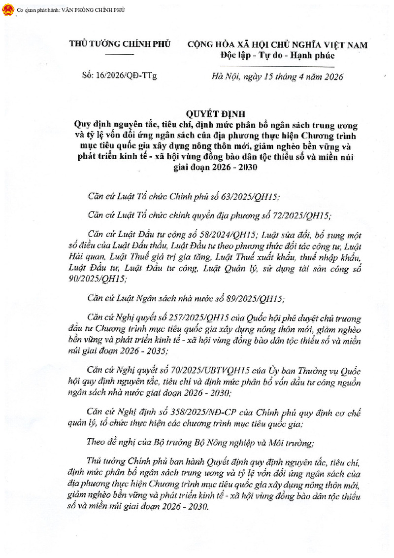 | Tiêu đề văn bản | Quyết định Quy định nguyên tắc tiêu chí định mức phân bổ ngân sách trung ương và vốn đối ứng địa phương thực hiện Chương trình MTQG xây dựng NTM, giảm nghèo bền vững và phát triển KT-XH vùng đồng bào dân toocjt hiểu số và miền núi giai đoạn 2026-2030 | ||